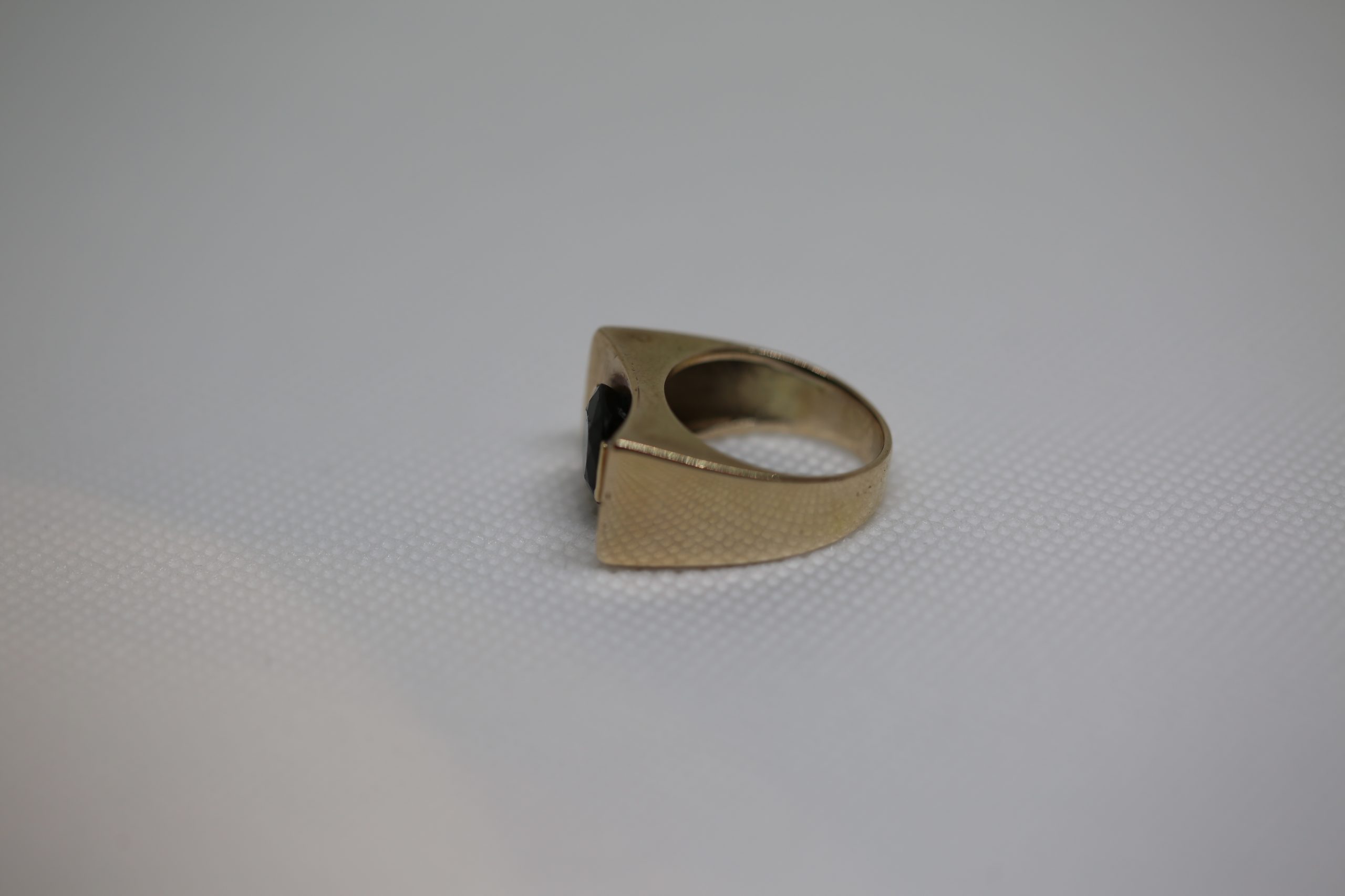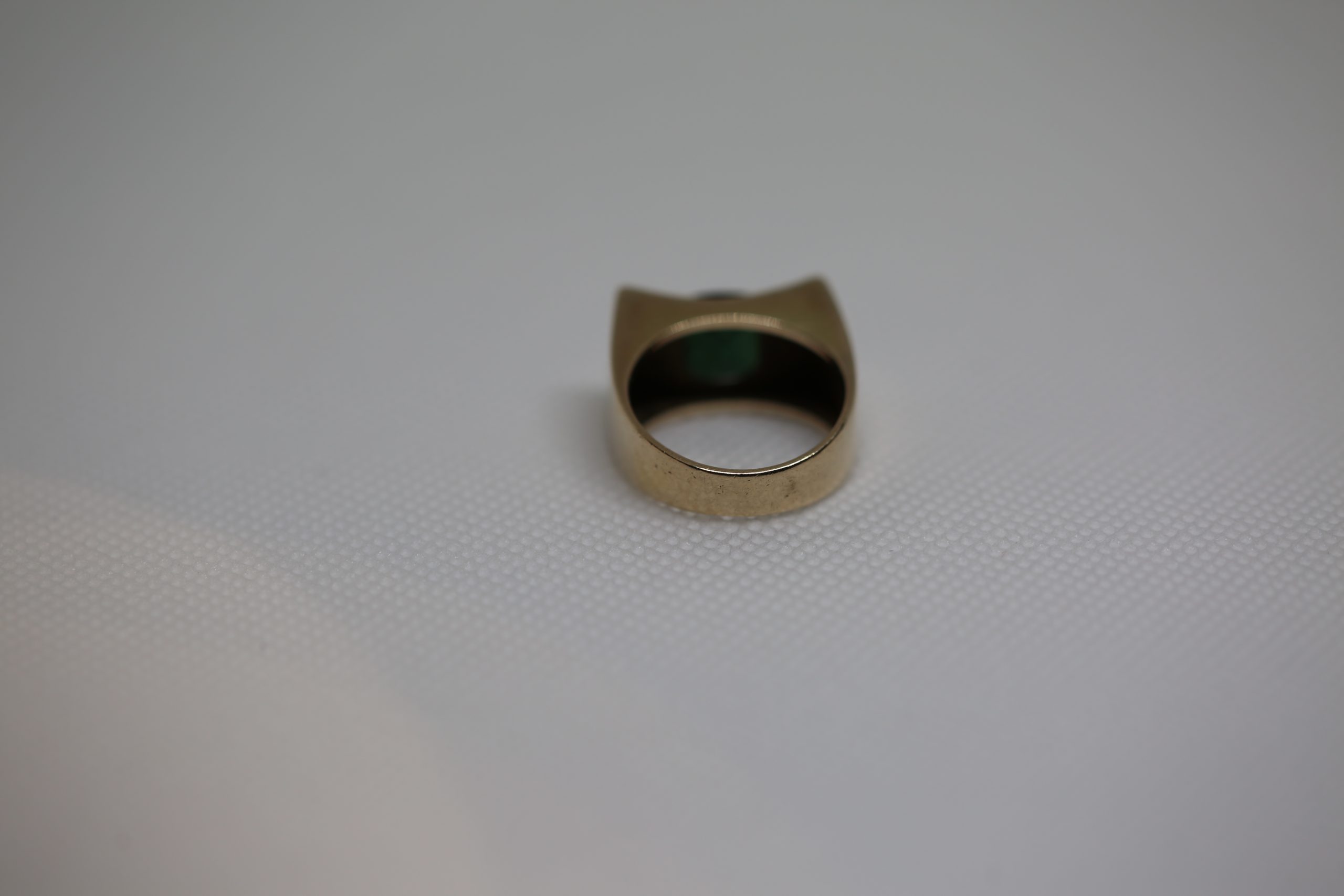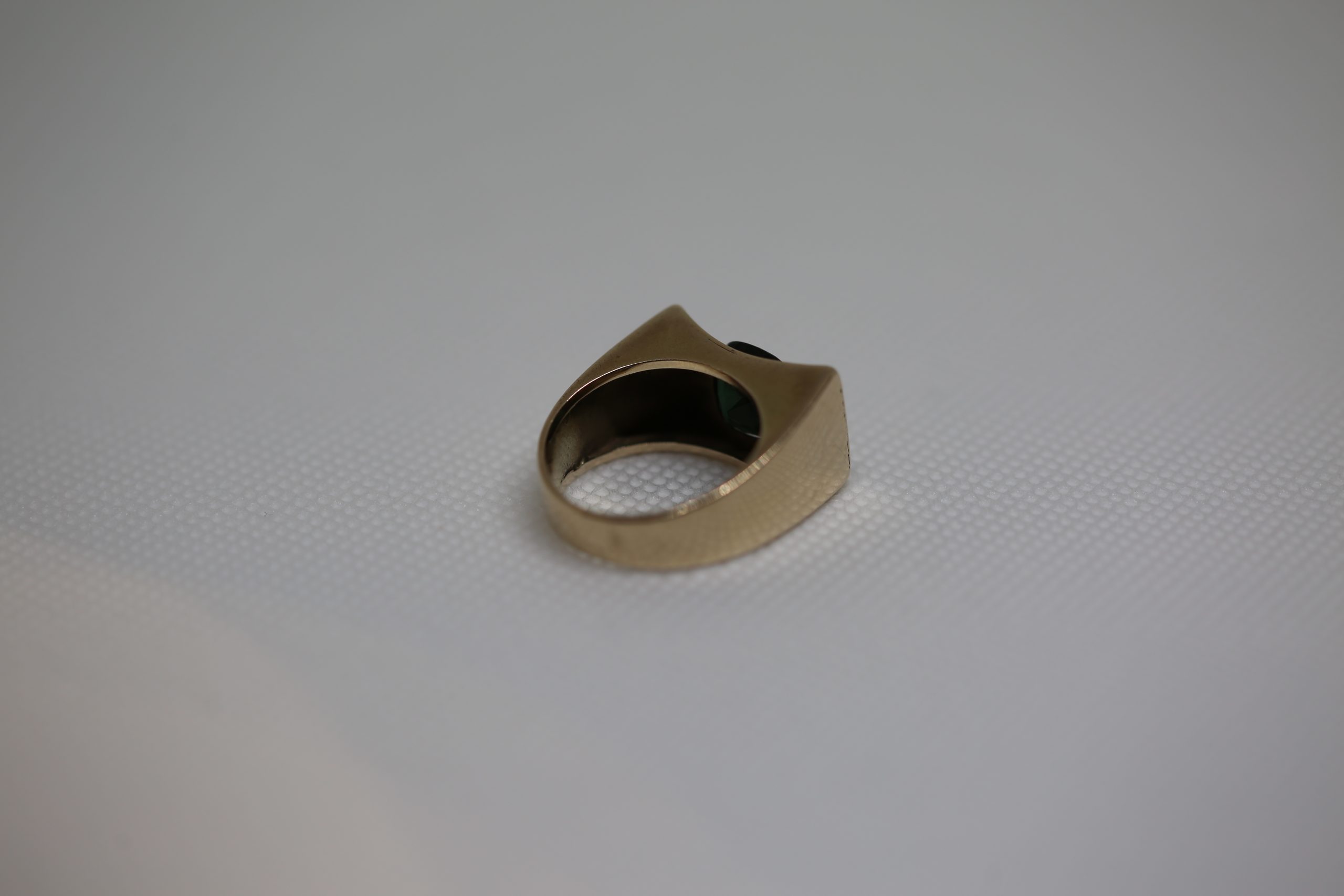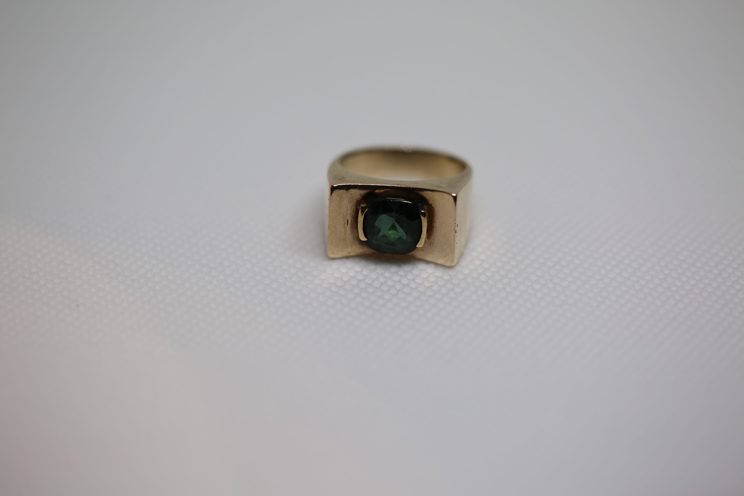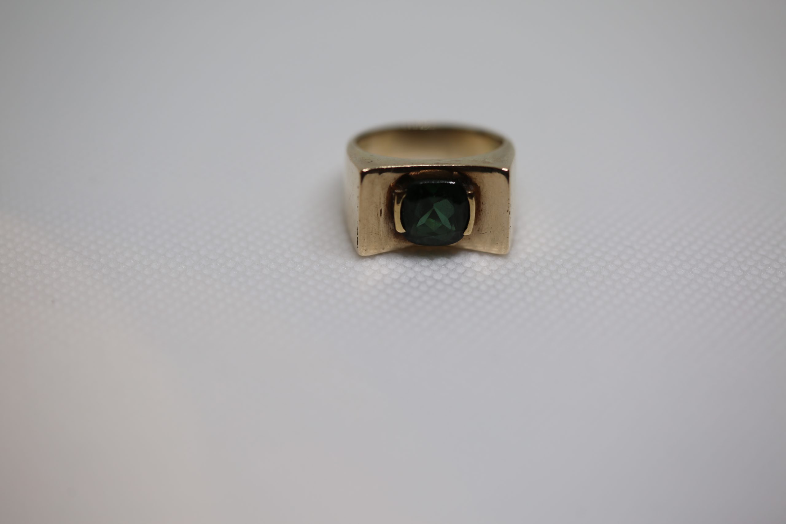 Sortija oro amarillo ancha con piedra verde. Es una talla 14.