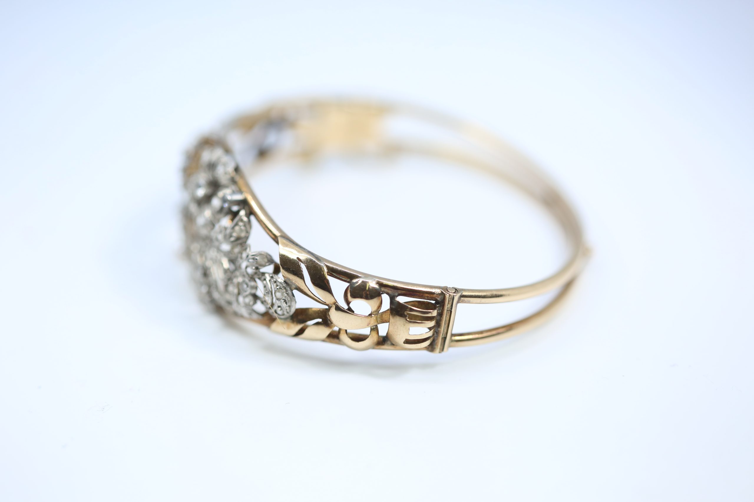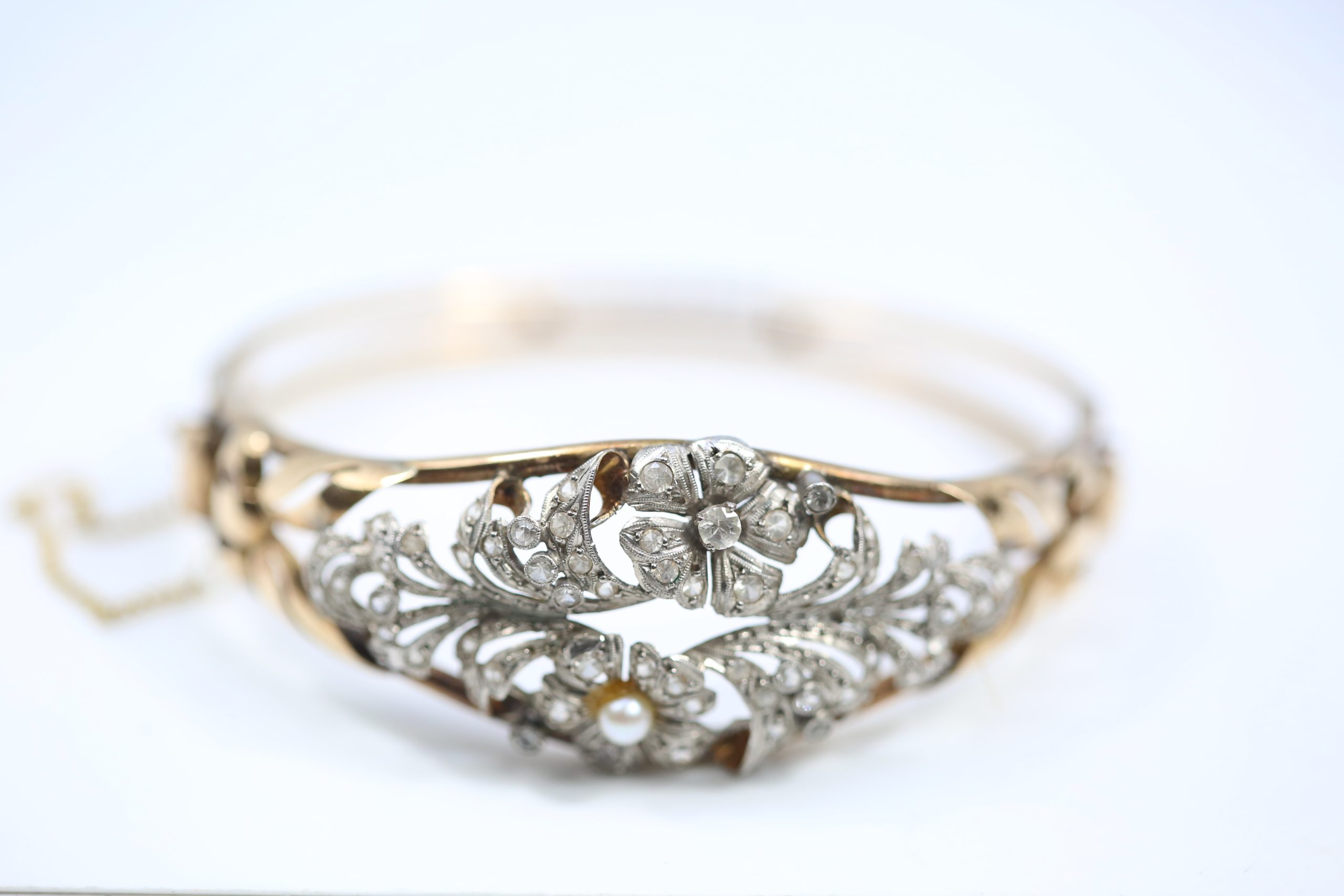 Pulsera tipo pedida de oro 18 kilates con vistas de platino y perla. Pesa 17 g. Tiene un diámetro de 6 cm.